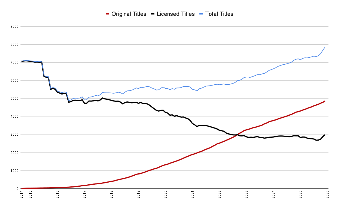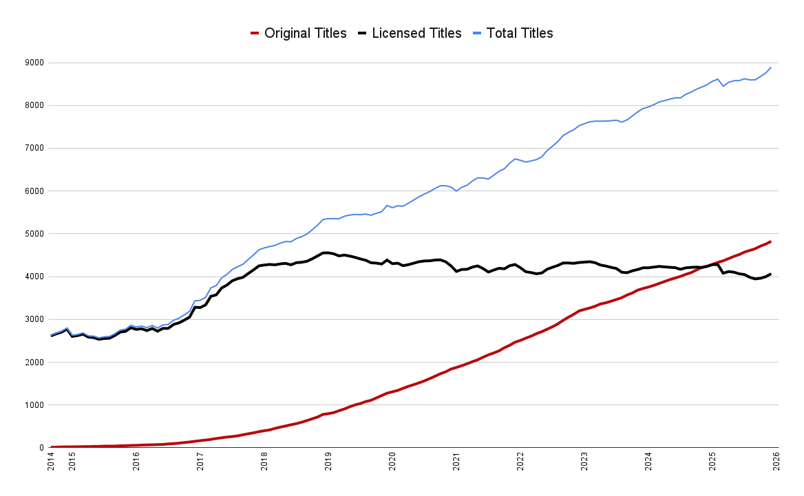As you can see, licensed content has stayed fairly level over the last few years, with the steady increase of Originals accounting for the main increase in catalog numbers.
